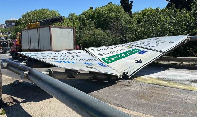 Kadıköy'de konteyner yüklü bir vincin bom kısmı seyir halindeyken baş üstü yönlendirme levhasına takıldı. Olayda yaralanan olmazken, levhada ve vinçte maddi hasar oluştu.