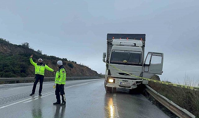 Bursa'nın İznik ilçesi, Yenişehir-İznik Yolu üzerine 54 H 0332 plakalı kamyon sürücüsünün kontrolünden çıkarak bariyerlere çarptı. Aracın uçuruma uçtuğunu zanneden sürücü kapıyı açıp aşağı atladı. Fakat kamyon sürücüsüz halde 400 metre boyunca ters yönden ilerleyip bariyerlere çarparak emniyet şeridinde durdu. İhbar üzerine Bursa İznik İlçe Jandarma Komutanlığı ekiplerince kazayla ilgili tahkikat başlatılırken, hafif yaralanan sürücü ise İznik Devlet Hastanesine sevk edildi.