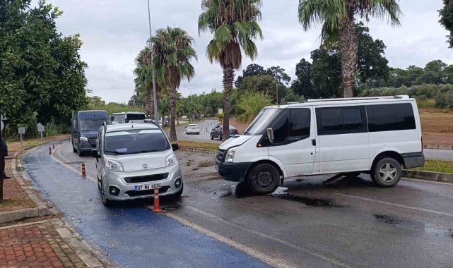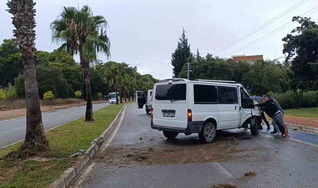 Antalya'nın Manavgat ilçesinde yağmur nedeniyle kayganlaşan yolda sürücüsünün direksiyon hakimiyetini kaybettiği kamyonet, önce kaldırıma, ardından palmiye ağacına çarptı. Güvenlik kamerasına yansıyan kazada yaralanan olmazken, araç yolun ortasında kalınca trafik bir süre aksadı.