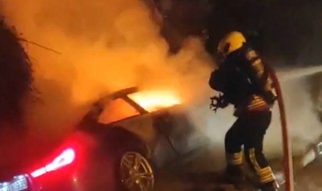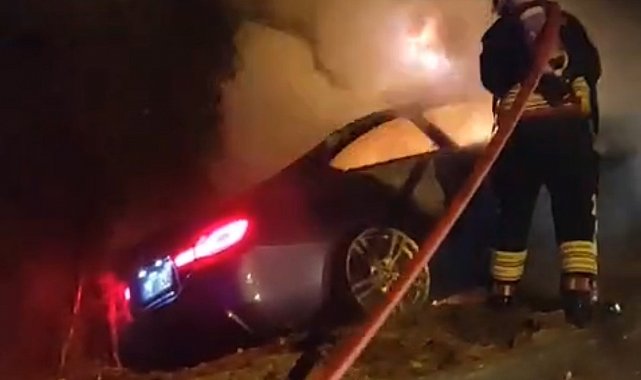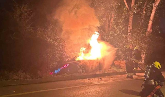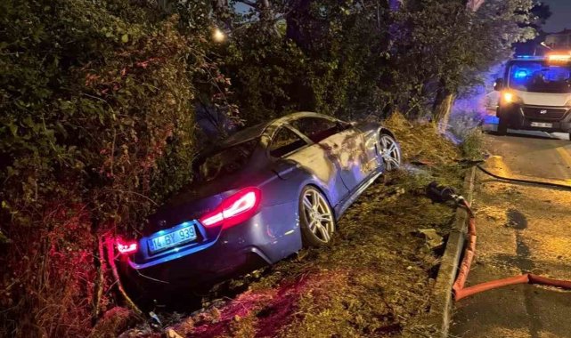 Kontrolden çıkan lüks araç ağaçlara çarparak alev alev yandı