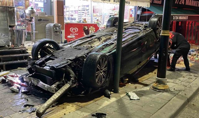 Kontrolden çıkan otomobil 2 iş yerine çarparak devrildi
