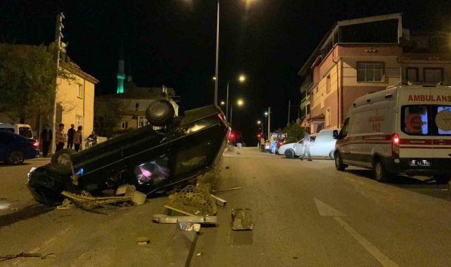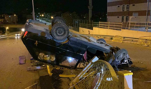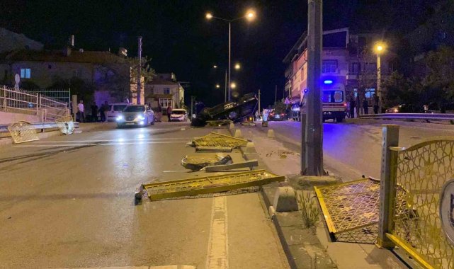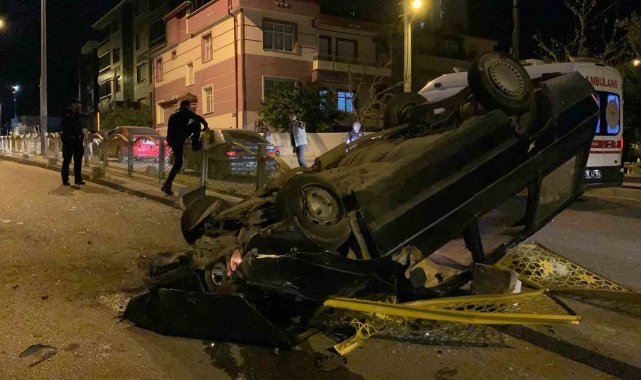 Kontrolden çıkan otomobil demir korkuluğa çarparak ters döndü