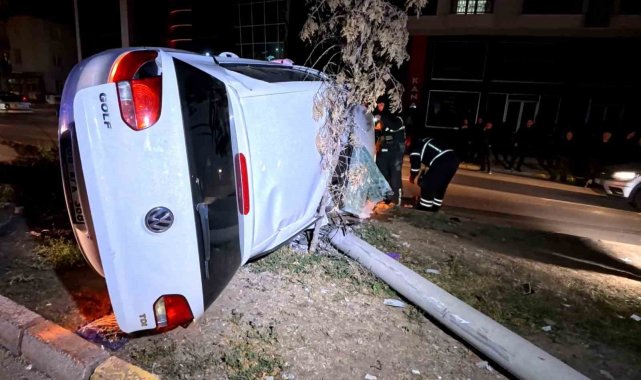 Kontrolden çıkan otomobil, direği ve ağacı devirdi: 2 kişi yaralandı, kurtarma anları kamerada
