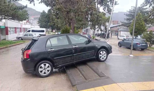 Amasya'da sürücüsünün kontrolünden çıkan otomobil yöneldiği karşı şeritte otobüs durağını teğet geçip direğe çarptı. Durakta bekleyenlerin tehlike atlattığı anlar kameraya yansıdı.