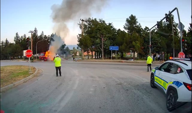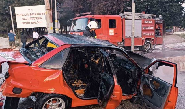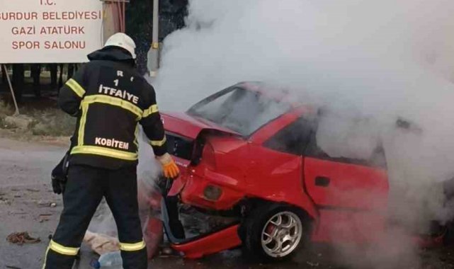 Burdur'da sürücüsünün direksiyon hakimiyetini kaybettiği otomobil önce refüje, ardından önünde seyreden tırın dorsesine çarparak alev aldı. Ağır yaralanan sürücü, vatandaşlar tarafından araçtan çıkarıldı.