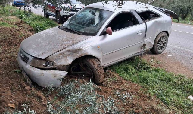 Boyalıca Mahallesi'nde kontrolden otomobil, zeytin bahçesine uçtu. Şoför ve yanındaki kız arkadaşı yara almadan kazayı atlattı.
