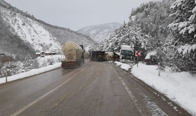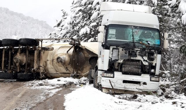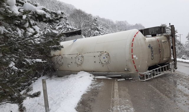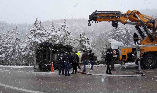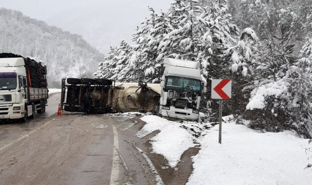 Bolu'da kar yağışı sebebiyle kontrolden çıkan soda yüklü tır, devrildi.