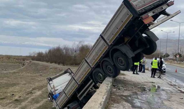 Bitlis'in Adilcevaz ilçesinde kontrolden çıkan tırın ihata duvarında asılı kalması sonucu 1 kişi yaralandı.