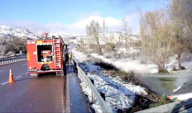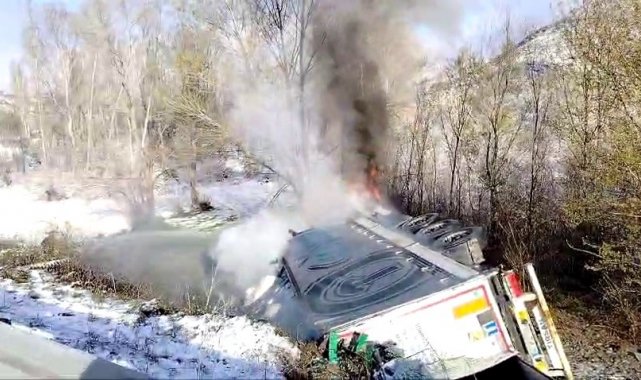 Sivas'ta kontrolden çıkarak yol kenarına devrilen tır, alev aldı. Feci kazada tır sürücüsü hayatını kaybetti.