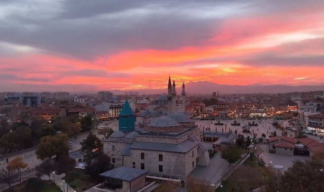 Konya'da akşam saatlerinde gün batımı sırasında ve sonrasında gökyüzünde oluşan kızıllıkla birlikte etkileyici manzaralar oluştu. Farklı zaman dilimlerinde dron ile kaydedilen görüntülerde, Mevlana Müzesi ve Sultan Selim Camii'nden güneşin batışı, oluşan kızıllık, bulutlar, Konya'nın yeşil kubbesi Kubbe-i Hadra, Altın Çarşı ve Tarihi Bedesten Çarşısındaki binaların kartpostallık görüntüleri yer aldı. Panorama Müzesi, Mevlana Kültür Merkezi ve İstiklal Harbi Şehitliği de gün batımında dikkat çekerken, Akyokuş Mevkiindeki Akyokuş Kasrı da etkileyici manzaralar oluşturdu.