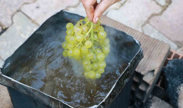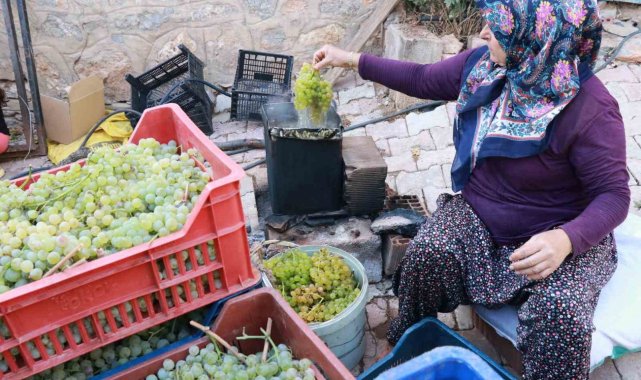 Gök üzüm üreticilerinden Hatice Yaşadı, gök üzümün zahmetli sürecini anlatarak, "Bu üzüm Yağcı Mahallesi'ne özgüdür. Bizim köyün geçim kaynağıdır. Üzüm bandırma işleminin özelliği, yeşil kalması ve rengini koruması içindir. Ateşin üzerinde kaynayan potaslı suya biraz zeytinyağı ekledim. Ne çok kaynatılacak ne de çok soğuk olacak. Bu suya batırdıktan sonra gölgede kurutuyoruz. Çok zahmetli bir iş, iğne oyası gibi. Bağdan kestik geldik, uğraşıyoruz, çatıya asıyoruz. Kuruduktan sonra tek tek ayıklıyoruz, sonra kalitesine göre sınıflandırıyoruz" dedi.