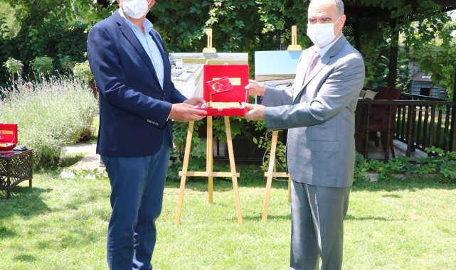 Konya Valisi Vahdettin Özkan, İl Jandarma Komutanı Tuğgeneral Şakir Uslu ve İl Emniyet Müdürü Engin Dinç'in katılımıyla Konya Ticaret Borsası (KTB) Başkanı Hüseyin Çevik ve yönetimine Yunak ilçesinde yapılan jandarma binasına katkılarından dolayı plaket takdiminde bulundu.