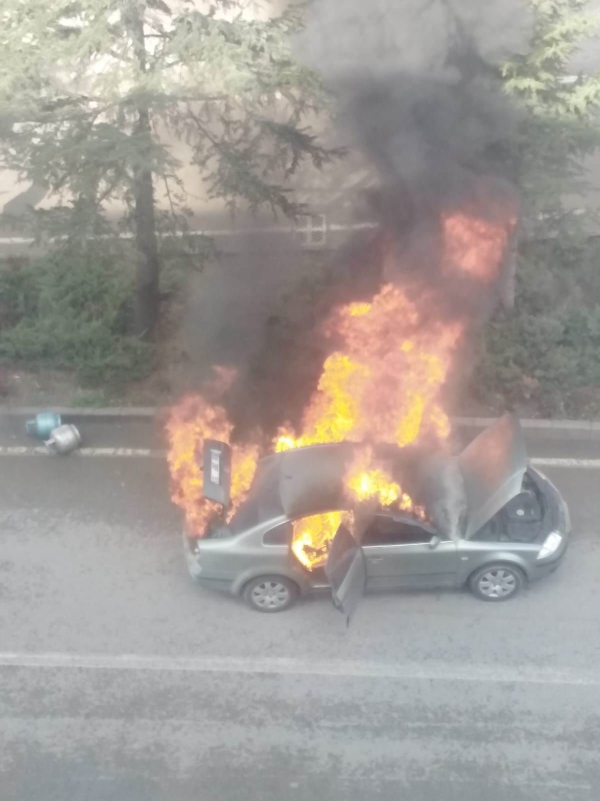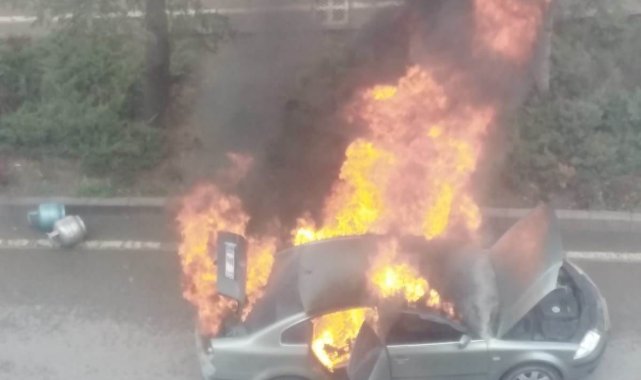 Alev topuna dönen otomobilde yaşanan patlamalar paniğe neden olurken, yaralanan araç sürücüsü hastaneye kaldırıldı