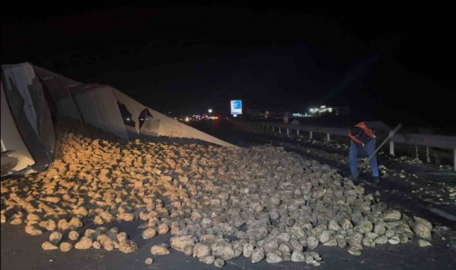 Köpeğe çarpmamak için sürücüsünün manevra yaptığı pancar yüklü tır refüje devrildi