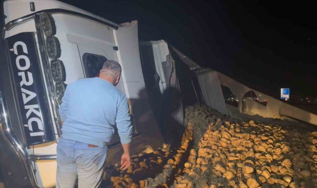 Aksaray'da sürücüsünün köpeğe çarpmamak için manevra yaptığı pancar yüklü tır refüje devrildi. Pancarların döküldüğü yol ulaşıma kapanırken, kazaya sebep olan köpeğin ise olay yerinden ayrılmadığı görüldü.