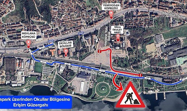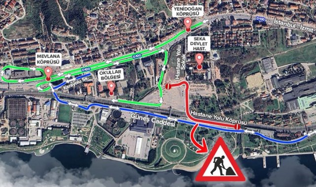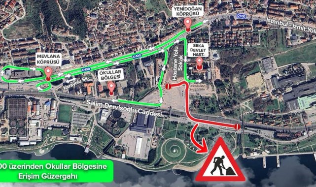 İzmit yönünden D-100 Karayolu'nu kullanan vatandaşlar Mevlana Köprüsü'nden dönüş yaparak Ulaşım Dairesi Başkanlığı önündeki yola bağlanıp, İstanbul yönünden gelen vatandaşlar da D-100 Karayolu'ndan Ulaşım Dairesi Başkanlığı'nın önündeki yolu kullanarak Okullar Bölgesi'ne ulaşabilecek. Salim Dervişoğlu Caddesi (Sekapark sahil yolu) üzerinden gelen vatandaşlar ise Maide Kavşağı üzerinden Mevlana Köprüsü'nü kullanarak Karayolu Sokak veya Ulaşım Dairesi Başkanlığı önündeki yolu kullanarak okullar bölgesine ulaşabilecek. Salim Dervişoğlu Caddesi üzerinden gelen vatandaşlar, Mevlana Köprüsü'nden D-100 Karayolu'na çıkıp Hastane Yolu Sokak'ı kullanarak hastaneye ulaşabilecek. Diğer erişim yönlerinden gelenler için bir değişiklik olmadığı belirtildi.