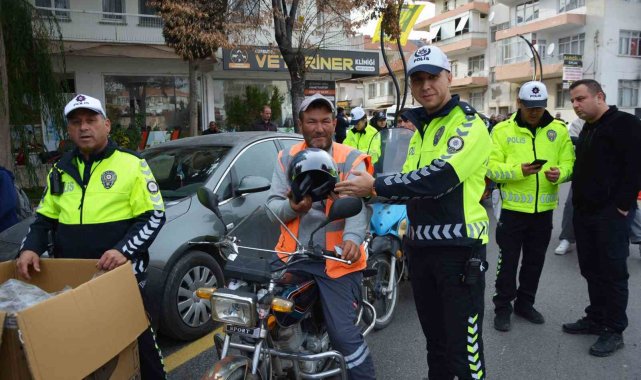 Korkuteli ilçesinde polis ekipleri tarafından motosiklet sürücülerine ücretsiz kask dağıtıldı.