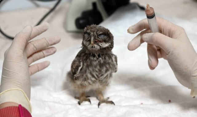 Koruma altına alınan yavru baykuşu şırıngayla besliyorlar