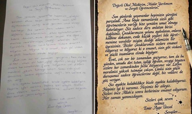 "Değerli okul müdürüm, müdür yardımcım ve sevgili öğretmenlerim. Son günlerde yaşananlar hepimizin yüreğini parçaladı. Ama böyle zamanlarda sizin gibi öğretmenlerin varlığı bize yeniden umut olmayı hatırlatıyor. Siz sadece ders anlatan birisi değilsiniz. Çocuklarımızın yolunu aydınlatan, onların kalbine dokunan, evde küçük şeyleri bile öğretmenime verebilir miyim dediği ailemizin bir üyesisiniz. Bizler çocuklarımızı sizlere emanet ediyoruz ve biliyoruz ki o emanet, sizin gibi vicdanlı ve güçlü insanların elinde büyüyor. Evet, çok zor bir zamandan geçiyoruz, tam da bu yüzden, umudu diri tutan, iyiliği öğreten, sevgiyi büyüten sizlere her zamankinden fazla ihtiyacımız var. Lütfen moralinizi yüksek tutmaya çalışın. Çünkü sizin güçlü duruşunuz sadece öğrencilerine değil, biz velilere de güç veriyor. Siz ayakta kalabildikçe bizde ayakta kalabiliyoruz. Hepiniz iyi ki varsınız. Hepimiz bir aileyiz. Sizleri önce Allah'a sonra birbirinize emanet ediyorum. Her zaman yanınızdayım. Sizleri çok seven veliniz Emir Ayşe Ünsal."