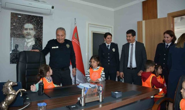Muğla'nın Köyceğiz ilçesinde Polis Haftası kapsamında İlçe Milli Eğitim Müdürü Kerem Karahan, Köyceğiz Anaokulu idareci, öğretmen ve öğrencileri ile birlikte Köyceğiz İlçe Emniyet Müdürü Hüseyin Başkan'ı ve emniyet personelini makamında ziyaret etti.