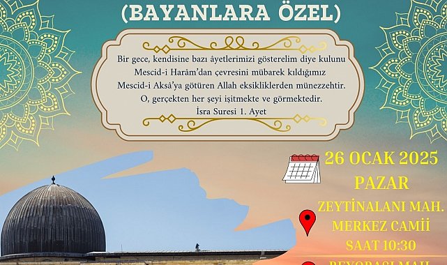 İlçe Müftüsü Ahmet Karagöz Miraç Kandili vesilesiyle açıklamalarda bulunarak; "İsrâ ve Miraç, Sevgili Peygamberimiz (s.a.s)'in bir gece Mescid-i Haram'dan Mescid-i Aksâ'ya, oradan da Yüce Mevla'nın sonsuz ayet ve kudretini müşahede etmek için semaya yaptığı, içinde pek çok ilahî hikmet ve bereketi barındıran manevî bir yolculuktur" dedi.