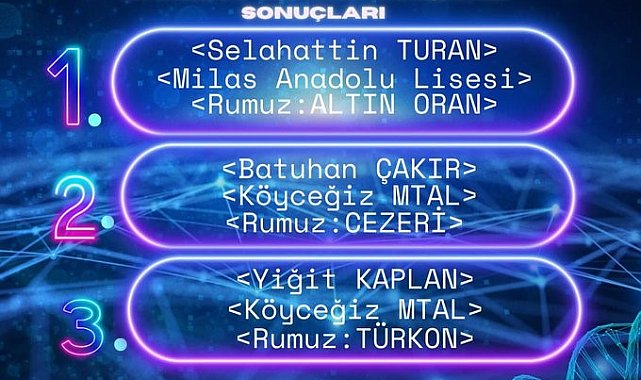 Muğla İl Milli Eğitim Müdürlüğü tarafından düzenlenen 'Aklın Yolu Maarif Etkinlikleri Liseler Arası Akıl ve Zekâ Oyunları Tasarım Yarışması' sonuçlandı. Akıl ve Zekâ Oyunları Tasarım Yarışmasında yapılan değerlendirmelere göre; 1. Selahattin Turan-Milas Anadolu Lisesi, 2. Batuhan Çakır-Köyceğiz Mesleki ve Teknik Anadolu Lisesi, 3. Yiğit Kaplan-Köyceğiz Mesleki ve Teknik Anadolu Lisesi oldu. Akıl ve Zekâ Oyunları Tasarım Yarışmasında liseli öğrenciler hem stratejik düşünme hem de özgün tasarım becerilerini ortaya koydu.