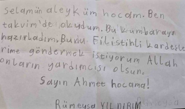 Muğla'nın Köyceğiz İlçesi Sultaniye Mahallesi'nde oturan İlkokul üçüncü sınıf öğrencisi Rumeysa Yıldırım okuduğu takvim yaprağından etkilenerek sadaka kutusu oluşturup Filistinliler için yardım biriktirdi. Kendi elleriyle yaptığı sadaka kutusunda biriken paraları babası Hüseyin Yıldırımla birlikte Köyceğiz İlçe Müftülüğü'ne gelerek Filistinlilere gönderilmek üzere TDV Köyceğiz Şube Başkanı ve İlçe Müftüsü Ahmet Karagöz'e sadaka kutusuyla 620 TL'yi teslim etti.