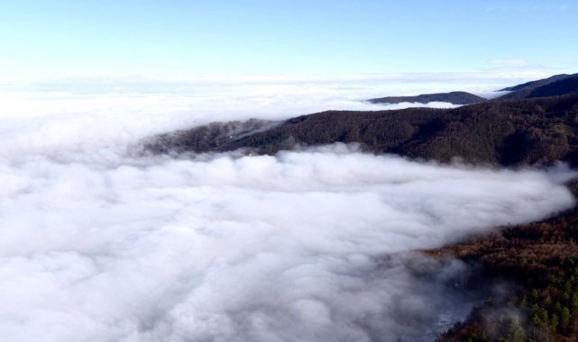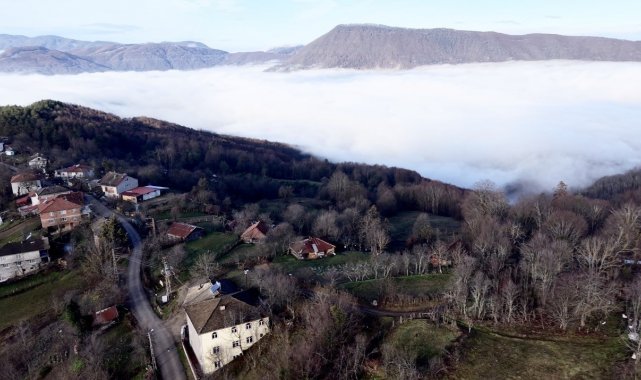 Karabük'ün Yenice ilçesinde köyü ve dağ eteklerini kaplayan sis bulutu, dronla havadan görüntülenirken ortaya çıkan manzara izleyenleri hayran bıraktı.