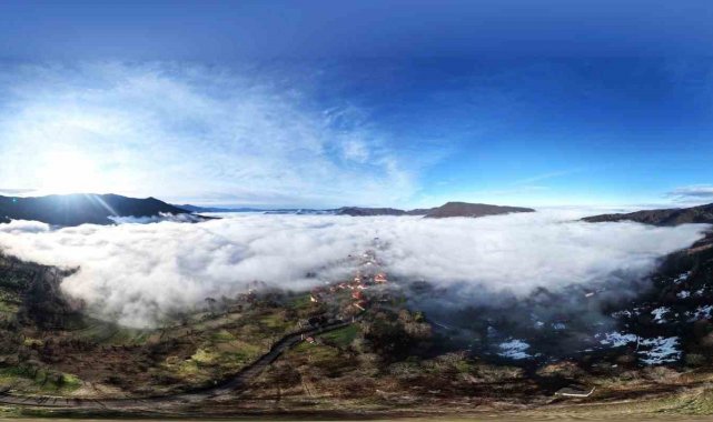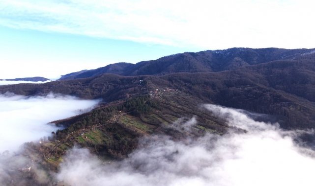 Dağ eteklerini ve köy üzerini örtü gibi saran sis tabakası doğa tutkunu Muhammet Yılmaz tarafından dron ile görüntülendi.
