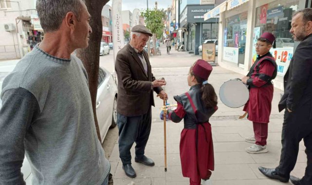 Adana'da bir grup ilkokul öğrencisi, Marif'in Kalbinde Ramazan etkinliği kapsamında ellerinde teflerle sokağa çıkıp ilahiler söyledi.