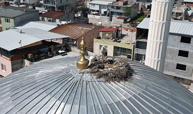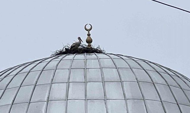 Kubbedeki leylekler mahalle yaşantısına renk katıyor