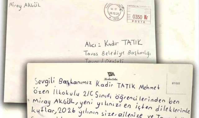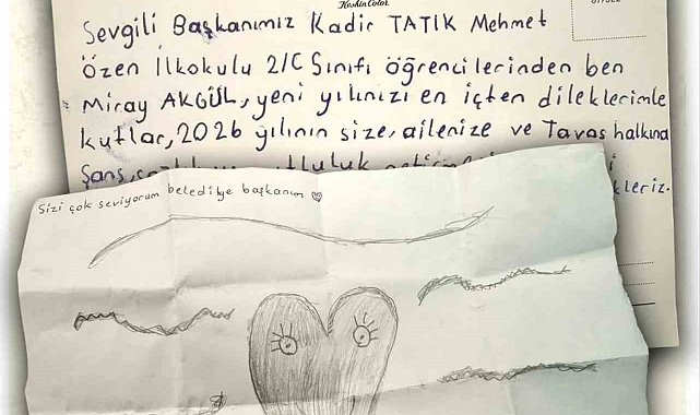 Küçük Miray Akgül mektubunda, "Sevgi Başkanımız Kadir Tatık; Mehmet Özen İlkokulu 2/C sınıfı öğrencilerinden ben Miray Akgül. Yeni yılınızı en içten dileklerimle kutlar, 2026 yılının size, ailenize ve Tavas halkına şans, sağlık ve mutluluk getirmesini temenni ederim. Sınıfımıza en kısa zamanda sizleri bekleriz" ifadelerine yer verdi.