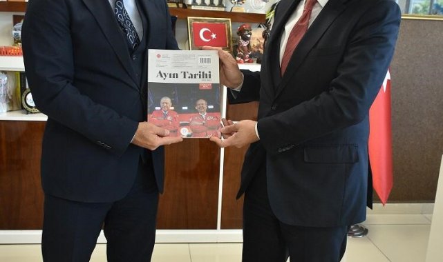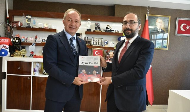 Cumhurbaşkanlığı İletişim Başkanlığı Erzurum Bölge Müdürü Recep Küçükece, Gençlik ve Spor İl Müdürü Levent Çakmur'u ziyaret ederek, Kuzey Kıbrıs Türk Cumhuriyeti'nde düzenlenen TEKNOFEST'in hikayesinin de yer aldığı 'Ayın tarihi' adlı dergiyi hediye etti.