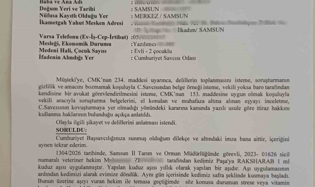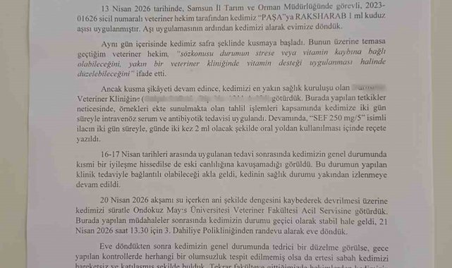 İlkadım ilçesinde yaşayan Şekercioğlu ailesinin 6 yaşındaki "Paşa" isimli British cinsi kedisi, kuduz aşısı yaptırılmak üzere Samsun Tarım ve Orman İl Müdürlüğü'ne götürüldü. Ailenin iddiasına göre Hindistan menşeili "Raksharab" isimli aşının uygulanmasının ardından kedi kusmaya başladı. İlk gün çok sayıda kusma yaşayan hayvan, veteriner müdahalesiyle kısa süreli toparlanma gösterse de birkaç gün sonra yeniden fenalaştı. Fakülte hayvan hastanesine kaldırılan kedi, tedaviye cevap vermeyerek telef oldu. Kedinin ölümü üzerine aile, birçok evcil hayvanda aynı aşı sonrası ölümlerin yaşandığı gerekçesiyle CİMER'e ve Samsun Cumhuriyet Başsavcılığı'na, Tarım ve Orman İl Müdürlüğü hakkında şikayette bulundu.