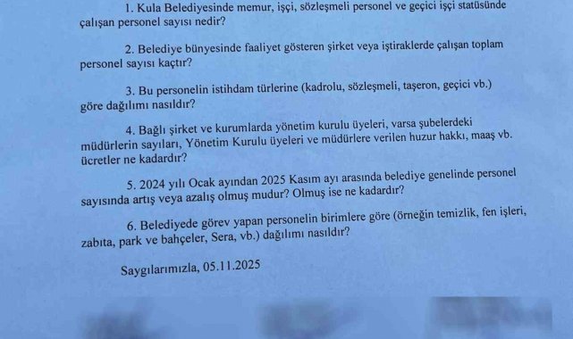 Kula Belediyesi'nde personel sayısı yeniden gündemde. Cumhur İttifakı Belediye Meclis üyeleri, belediyede görev yapan personel sayısı ve çalışanların görev dağılımıyla ilgili hazırladıkları soru önergesini meclise sundu. Ancak önerge, mecliste reddedildi. Önergenin reddedilmesine tepki gösteren Cumhur İttifakı meclis üyeleri, aynı içerikteki sorularını yazılı dilekçeyle Belediye Başkanlığına da iletti.