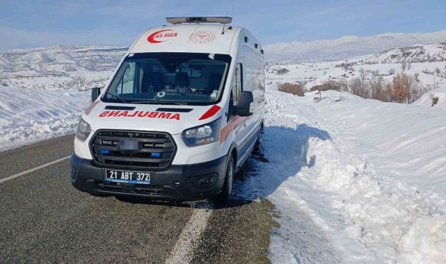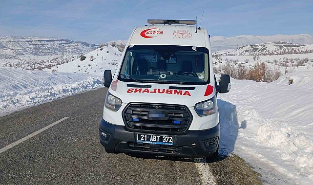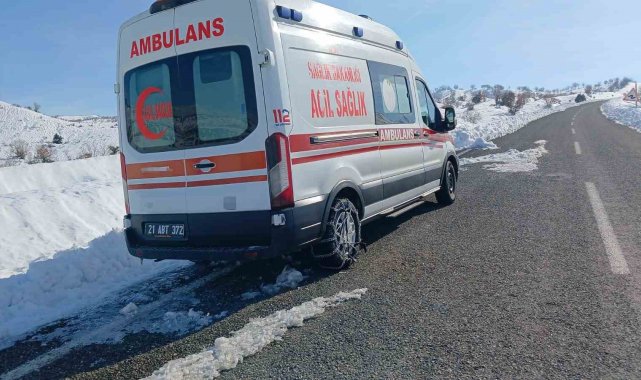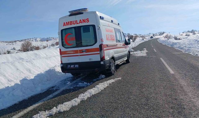 Diyarbakır'da kar ve soğuk havanın etkili olduğu Kulp ilçesinde bir ambulans arıza nedeniyle yol kenarında bekliyor.
