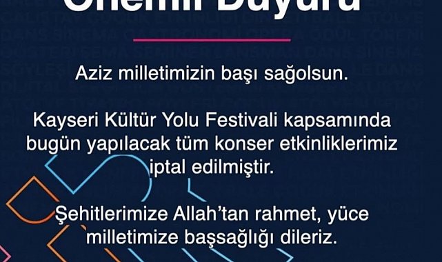 Yapılan açıklamada; "Aziz milletimizin başı sağ olsun. Kayseri Kültür Yolu Festivali kapsamında bugün yapılacak tüm konser etkinliklerimiz iptal edilmiştir. Şehitlerimize Allah'tan rahmet, yüce milletimize bağ sağlığı dileriz" denildi.