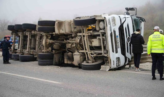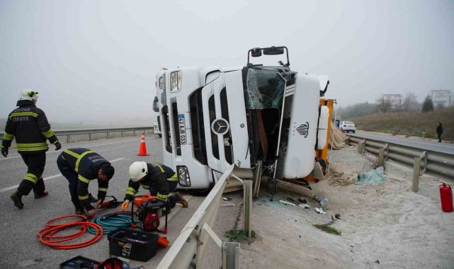 Kum yüklü tır devrildi: Sıkışan sürücü itfaiye tarafından kurtarıldı