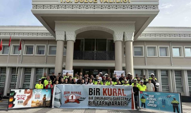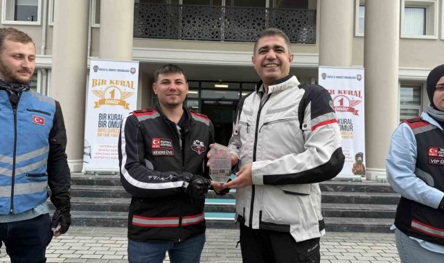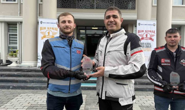 "Bir kural, bir ömür boyu sürecek" mottosuyla örnek gösterilen 3 motosikletliye teşekkür plaketlerini, Düzce Valisi Selçuk Aslan takdim etti. Plaket töreninin ardından, Trafik Haftası etkinlikleri kapsamında motosiklet turu düzenlendi.