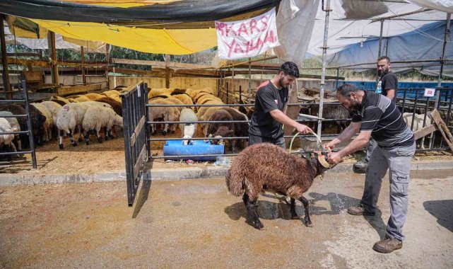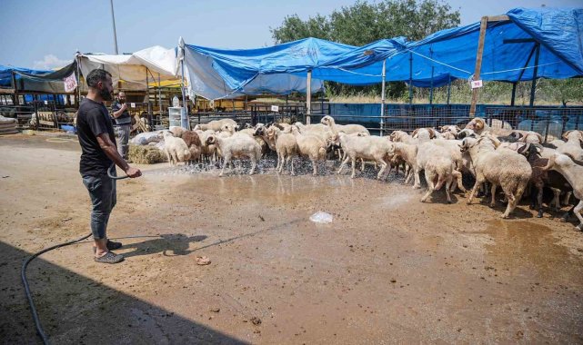 Öte yandan çadır altında bekleyen koçlar sıcak hava sebebiyle terlerken, yetiştiriciler ise hayvanların serinlemesi için farklı yöntemlere başvuruyor. Hayvan sahipleri, özellikle ayaklarda pişik ve sıcak çarpması riskine karşılık, kurbanlık koçların ayaklarına hortumla su tutarak serinletmeye çalışıyor.