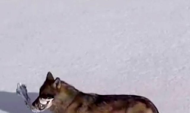 Kurtlar karlı arazide ağzında kemikle görüntülendi