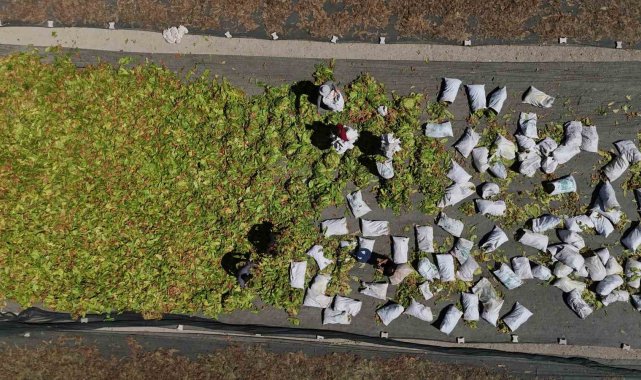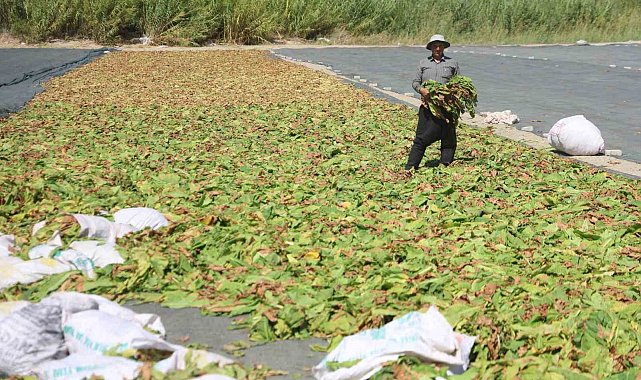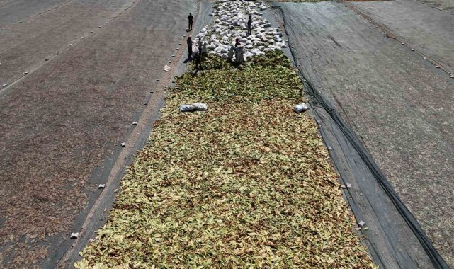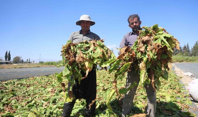 Hava sıcaklıklarının mevsim normallerinin üzerinde ilerlediği Hatay'da tütünde hasat devam ediyor. Tarlada zor şartlarda toplanan ve açık arazide kurutulmaya bırakılan tütün için çiftçilerin ve işçilerin zorlu mesaisi sürüyor. Antakya ilçesi Demirköprü Mahallesi'nde hasat edilen tütünün kurutulmaya bırakıldığı araziyse adeta renklendi. Çiftçi Cuma Yılmaz, kurutulmuş tütünün kilogram fiyatının tarladan 165 TL'den satıldığını söyledi.