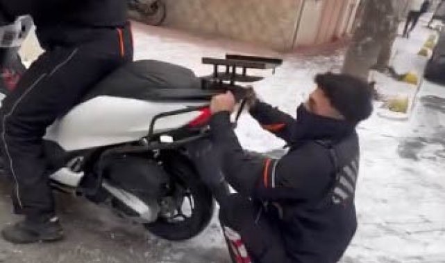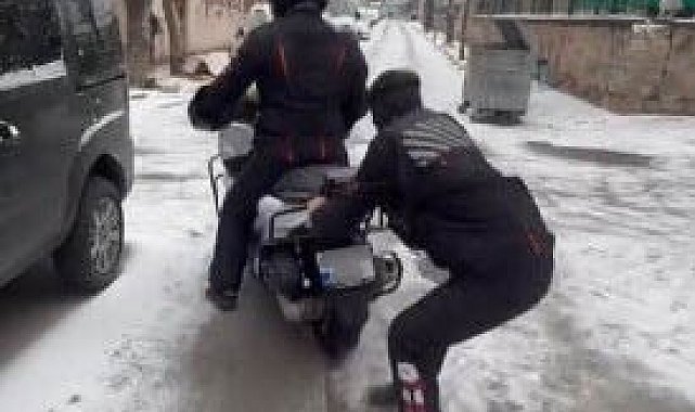 Eskişehir'de bir kuryenin, başka bir kurye tarafından kullanılan motosikletin arkasına tutunup buzlu zeminde kayarak eğlendiği anlara ait görüntüler sosyal medyada ilgi gördü.