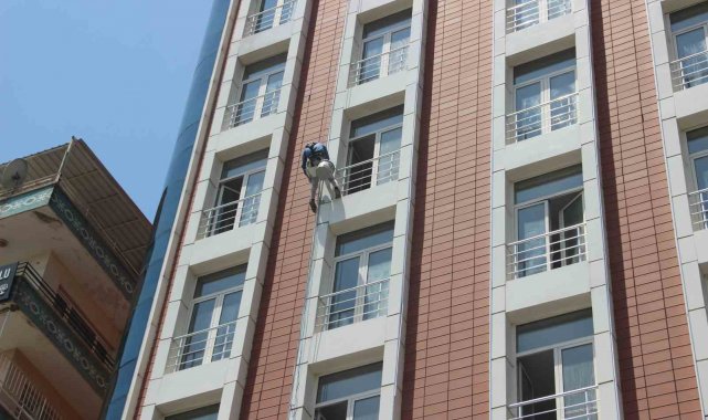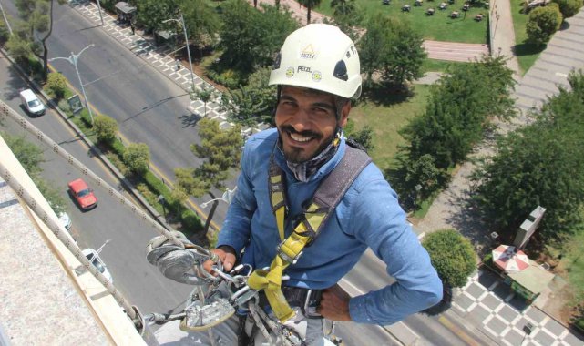 Şanlıurfa'da yüksekliği 50-60 metreyi bulan otel ve iş merkezlerinin dış cephelerinde çalışan endüstriyel dağcılar, komando teçhizatını andıran ekipmanlarla kendilerini iplere bağlayarak metrelerce yüksekte görev yapıyor.