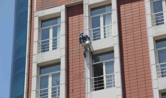 Mesleğini severek yaptığını aktaran işçi Mehmet Özçimen, "Cam temizliği yapıyoruz, boya yapıyoruz, montaj yapıyoruz, ondan sonra her türlü tamirat, tadilat işleri yapıyoruz. İskele kurmadan iple çevre rahatsızlık vermeden çalışıyoruz. Güzel ve temiz bir şekilde işimizi yapıp iniyoruz. 2014 yılından itibaren bu işe girdim. Yükseklikle ilgili aram gayet iyidir, alıştım. Herhangi bir korkum yok. Temiz bir şekilde işimizi yapıyoruz" dedi.