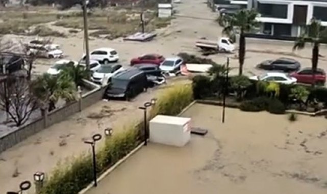 Aydın'ın Kuşadası ilçesinde etkili olan sağanak yağış sebebiyle dereler taştı, sokaklarda araçlar sel sularına kapıldı.