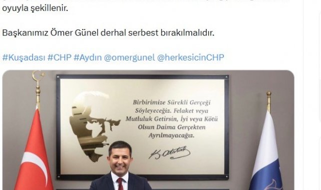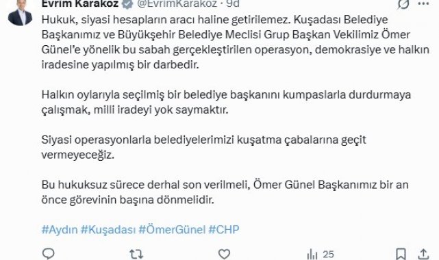 CHP Aydın Milletvekili Evrim Karakoz da, "Kuşadası Belediye Başkanımız ve Büyükşehir Belediye Meclisi Grup Başkan Vekilimiz Ömer Günel'e yönelik bu sabah gerçekleştirilen operasyon, demokrasiye ve halkın iradesine yapılmış bir darbedir. Halkın oylarıyla seçilmiş bir belediye başkanını durdurmaya çalışmak, milli iradeyi yok saymaktır. Bu hukuksuz sürece derhal son verilmeli, Ömer Günel Başkanımız bir an önce görevinin başına dönmelidir" ifadelerine yer verdi.