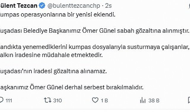 Olayı 'kumpas' operasyonu olarak nitelendiren CHP Aydın Milletvekili Bülent Tezcan, sosyal medya hesabından yaptığı açıklamada, "Kuşadası Belediye Başkanımız Ömer Günel, sabah gözaltına alınmıştır. Kuşadası'nın iradesi gözaltına alınamaz. Başkanımız Ömer Günel derhal serbest bırakılmalıdır" ifadelerini kullandı.