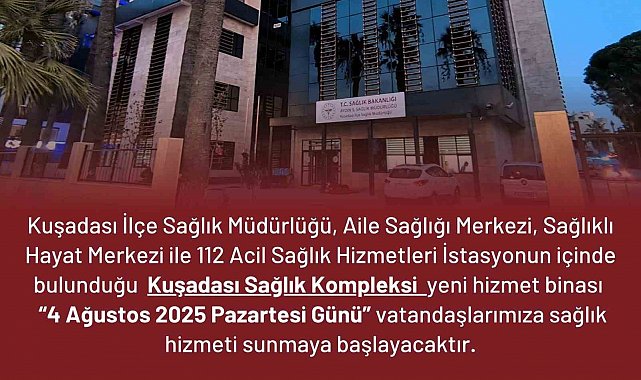 Aydın Valilisi Yakup Canbolat tarafından yapılan açıklamada, Kuşadası İlçe Sağlık Müdürlüğü, Aile Sağlığı Merkezi, Sağlıklı Hayat Merkezi ve 112 Acil Sağlık Hizmetleri İstasyonu'nu içeren yeni hizmet binasının aynı çatı altında vatandaşlara sağlık hizmeti sunacağı belirtildi. Açıklamada, "Kuşadası İlçe Sağlık Müdürlüğü, Aile Sağlığı Merkezi, Sağlıklı Hayat Merkezi ve 112 Acil Sağlık Hizmetleri İstasyonunu içeren yeni hizmet binasını 4 Ağustos Pazartesi günü hizmete açıyoruz. Aydın'ımıza hayırlı hizmetlere vesile olsun" ifadelerine yer verildi.