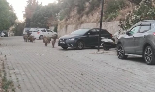 Aydın'ın Kuşadası ilçesinde aç kalan yaban domuzları şehir merkezine indi. Yaban domuzları şehir merkezine gelip sitelerin ara sokaklarında dolaştı. Çöp konteynerlerini karıştıran yaban domuzlarının yiyecek aradığı görüldü. Yavrularıyla birlikte sürü halinde sokaklarda dolaşan yaban domuzları otomobillerin arasında rahatça kimseye aldırış etmeden gezindi. O anlar ise çevre sakinlerinin cep telefonu kamerasına yansıdı. Görüntüde domuzların sokak aralarında yiyecek araması yer aldı.